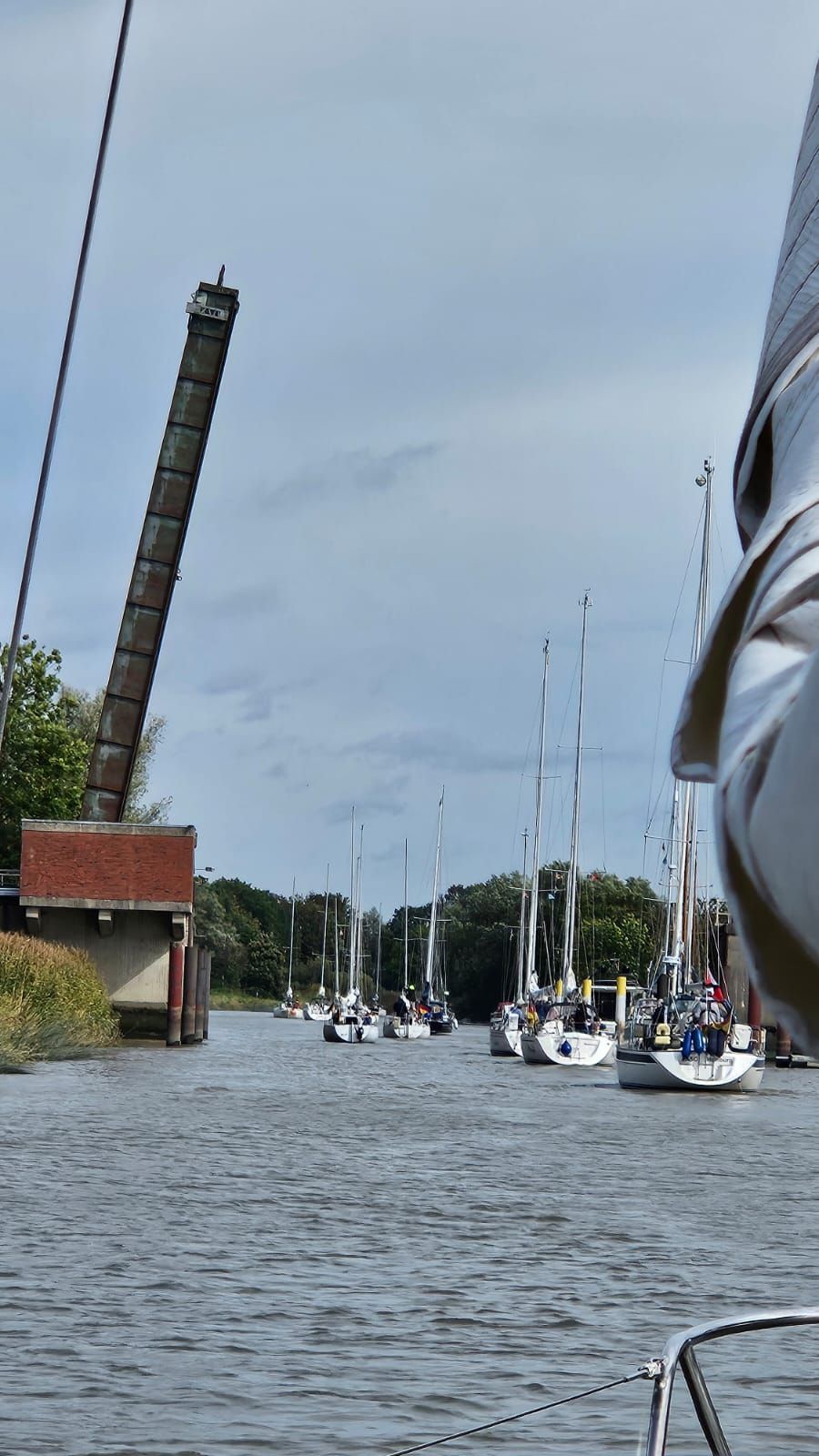 Im Laufe des Vormittags wurden die Menschen auf den Schiffen langsam lebendig. Es wurde zu Kenntniss genommen, dass es windig war. Glücklicherweise aus der richtigen Richtung. Über Funk wurde Windstärke 7 in Brunsbüttel gemeldet. Das ist schon ordentlich. In Stade hat man davon erstmal noch nicht viel gemerkt. Entsprechend zivilisiert lösten sich dann die Päckchen auf, und die 18 Schiffe fuhren im Gänsemarsch die Schwinge herunter.