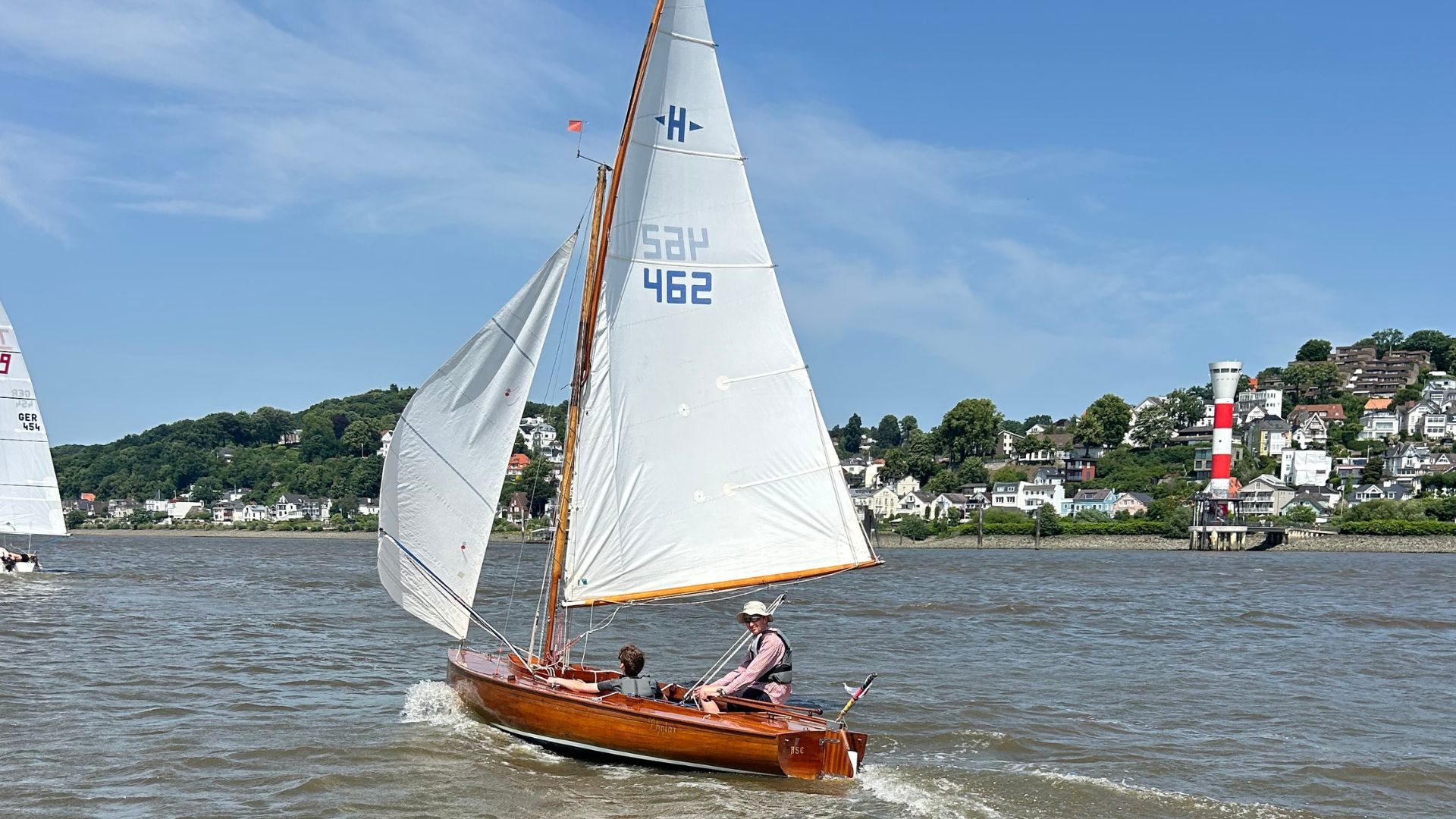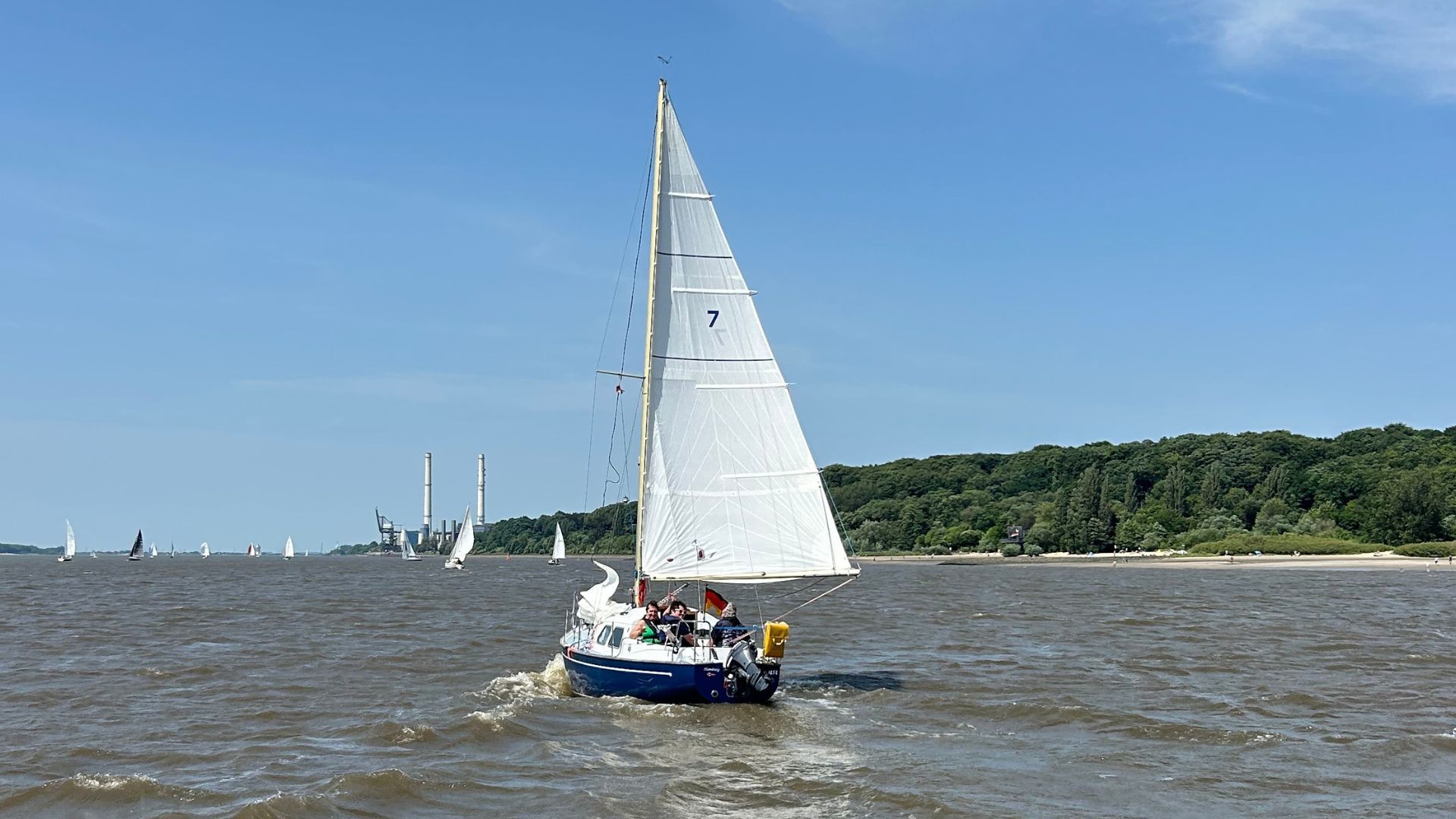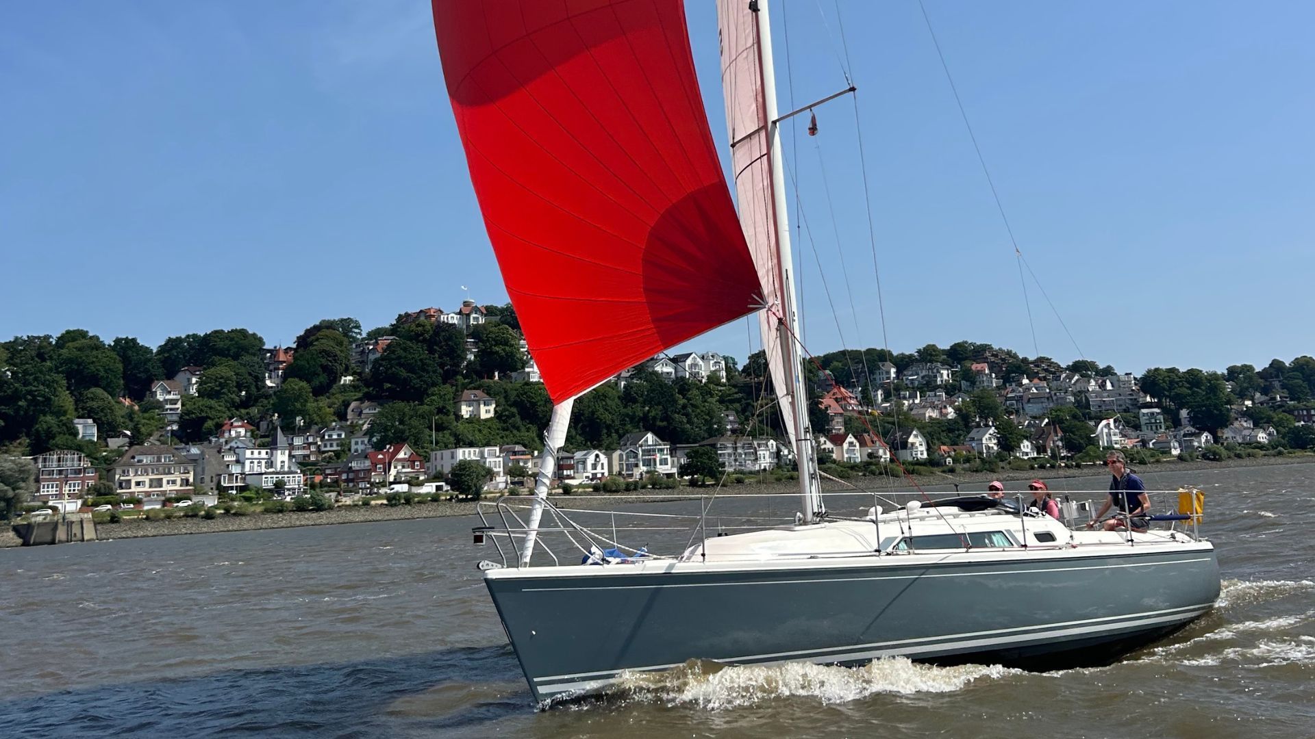 Es konnte also losgehen: Sonnabend, 12 Uhr Start, Ost „gute 4“, geschätzte 28 Grad, der Strom sollte gegen 14 Uhr bei Wedel kippen. Ein Start unter Spi, da hält man sich zunächst von der Startlinie fern, hat vorher ermittelt, wie lange man zur Startlinie braucht, eben alles, was Herr Diesch in seinem Werk „Regattasegeln“ (leider vergriffen) so empfohlen hat. Wir waren dann aber zu weit weg vom Startschiff, als dass wir die Signale hätten hören können. Und die Zahlenwimpel, na ja, die hatte ich noch nie so drauf. Aber irgendwann zogen die anderen ihre Spis, da konnten wir dann wohl auch los. Und wie: Eine rasante Fahrt, zum Glück kam der Wind hinter dem MüLo etwas raumer, nicht jeder hatte Lust zum Geigen. Um Tonne 118, dann in die Nebenelbe hinter Hanskalbsand, da war schon wenig Wasser, aber zum Glück sollte es ja nur außerhalb des Fahrwassers flach sein. Und zum Glück war das nur Sand oder Schlick und nichts härteres … Dann zurück ins Hauptfahrwasser und bei kippender Tide und somit zunehmendem scheinbaren Wind eine schöne Kreuz zurück zum Rüschkanal. Reffs lassen sich manchmal vermeiden, wenn man mal die Segel ordentlich durchsetzt… man lernt nie aus.