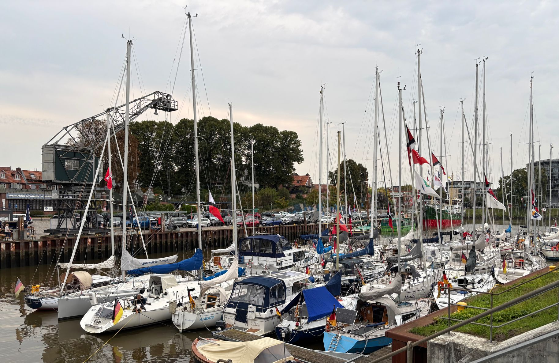 Im Laufe des Vormittags wurden die Menschen auf den Schiffen langsam lebendig. Es wurde zu Kenntniss genommen, dass es windig war. Glücklicherweise aus der richtigen Richtung. Über Funk wurde Windstärke 7 in Brunsbüttel gemeldet. Das ist schon ordentlich. In Stade hat man davon erstmal noch nicht viel gemerkt. Entsprechend zivilisiert lösten sich dann die Päckchen auf, und die 18 Schiffe fuhren im Gänsemarsch die Schwinge herunter.