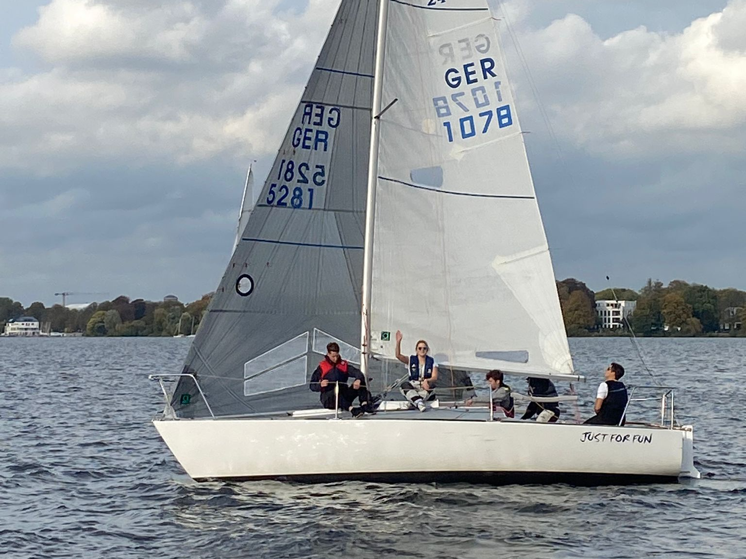 Am Freitagnachmittag brachten einige der Crew die J24 im Schleppverband in den City Sportboothafen. Von dort ging es mit der entsprechenden Genehmigung durch das Alsterfleet zum HSC. Der Mast wurde noch schnell gestellt und alles weitere für die Wettfahrt vorbereitet. Dem Tag der Regatta stand nichts mehr im Weg. Samstag, 22.10.2022 – Tag der Regatta Wir trafen und am Sonnabend so gegen 09:00 Uhr beim HSC. Leider herrschte zu der Zeit noch totale Flaute. Um 10:00 Uhr war Steuermannsbesprechung. Stand danach: erster Start um 12:30 Uhr. Wir hatten dementsprechend noch genügend Zeit die Segel anzuschlagen und das Boote Regattafertig zu machen. Das erste Team mit Henni als Steuermann ging gegen 12:00 Uhr auf die Bahn. Der Wind baute sich mit der Zeit auf, was für einen schnellen Start und einer gut gesegelten ersten Runde sorgte. Auf den entscheidenden Moment des Crewwechsels hatten wir entgegengefiebert. Ohne festzumachen und in kaum verminderter Fahrt, tauchten wir durch. Schnell das Ruder in die Hand und fahrt aufgenommen, ging es für das zweite Team, mit Lennard als Steuermann, in die erste Runde. Hoch zur Tonne, schneller Spi-Kurs, um die Tonne zur Kreuz und dann mit einem Affenzahn auf den Steg zu. Die Runden verliefen und das Wetter und die Laune während der Wettfahrt sowie auf dem Steg, wurden immer besser. Nach vielen gesegelten Runden näherte sich die Regatta für uns dem Ende. Noch eine spannende Runde, bei der wir beinahe unseren Vorschiffsmann verloren hätten, der leider am gerissenen Seezaun vorbei trat. Im Großen und Ganzen verlief die Regatta gut für uns. Wir haben in diesem Jahr genau die Mitte erreicht und somit den „Rüssels Napf“ gewonnen. Wir freuen uns, im nächsten Jahr wieder dabei zu sein