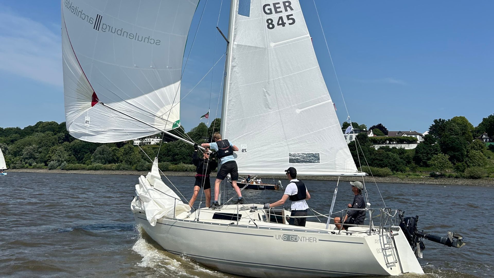 Es konnte also losgehen: Sonnabend, 12 Uhr Start, Ost „gute 4“, geschätzte 28 Grad, der Strom sollte gegen 14 Uhr bei Wedel kippen. Ein Start unter Spi, da hält man sich zunächst von der Startlinie fern, hat vorher ermittelt, wie lange man zur Startlinie braucht, eben alles, was Herr Diesch in seinem Werk „Regattasegeln“ (leider vergriffen) so empfohlen hat. Wir waren dann aber zu weit weg vom Startschiff, als dass wir die Signale hätten hören können. Und die Zahlenwimpel, na ja, die hatte ich noch nie so drauf. Aber irgendwann zogen die anderen ihre Spis, da konnten wir dann wohl auch los. Und wie: Eine rasante Fahrt, zum Glück kam der Wind hinter dem MüLo etwas raumer, nicht jeder hatte Lust zum Geigen. Um Tonne 118, dann in die Nebenelbe hinter Hanskalbsand, da war schon wenig Wasser, aber zum Glück sollte es ja nur außerhalb des Fahrwassers flach sein. Und zum Glück war das nur Sand oder Schlick und nichts härteres … Dann zurück ins Hauptfahrwasser und bei kippender Tide und somit zunehmendem scheinbaren Wind eine schöne Kreuz zurück zum Rüschkanal. Reffs lassen sich manchmal vermeiden, wenn man mal die Segel ordentlich durchsetzt… man lernt nie aus.